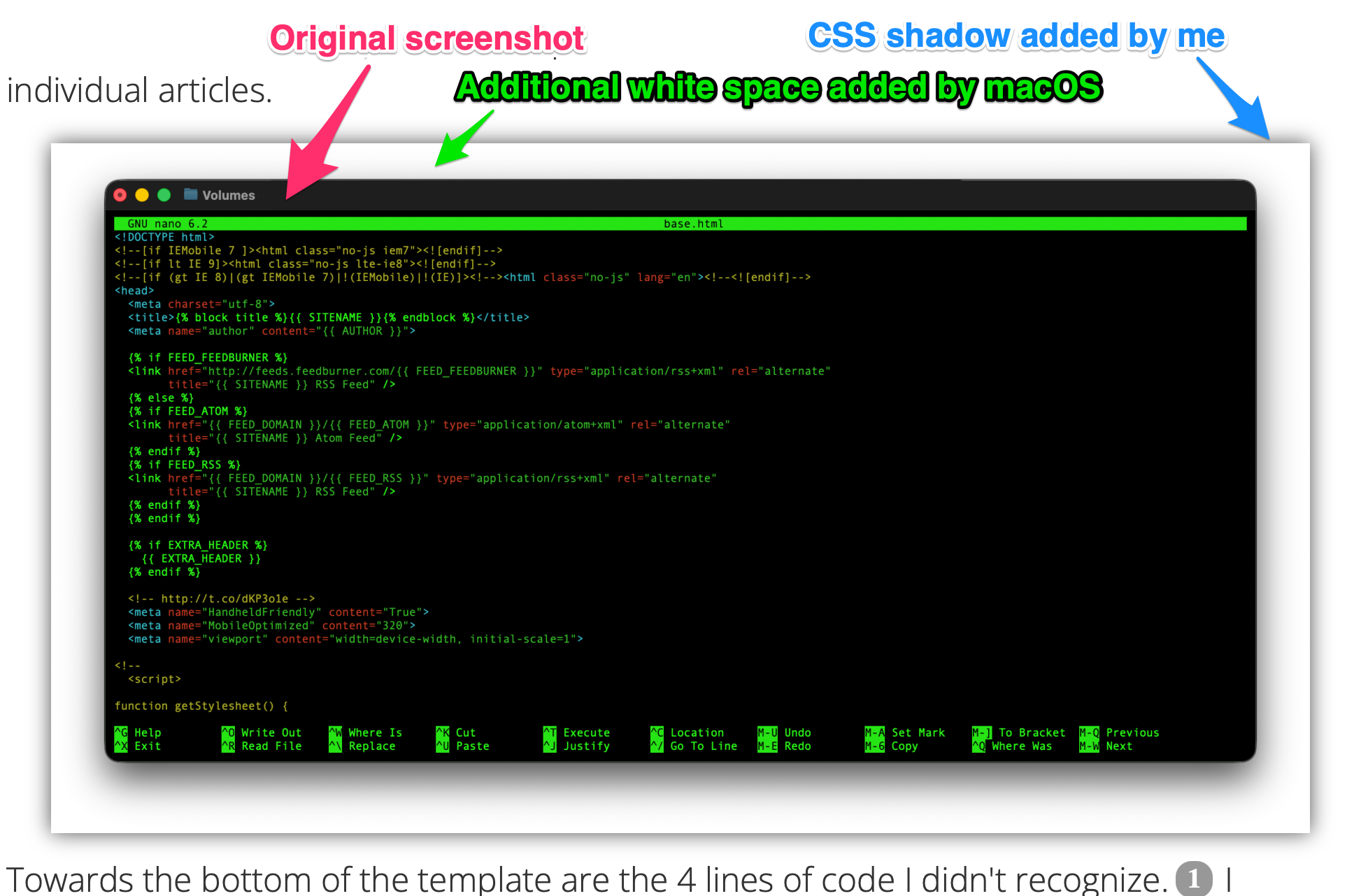 When I was proofing the post, everything looked good. After seeing screenshot I realized I hadn't fully vetted my proofing process. I'm on a new laptop and forgot (again)2 that macOS adds a wrapper and shadow box to all screenshots using the Shift-Cmd-4 keystroke.